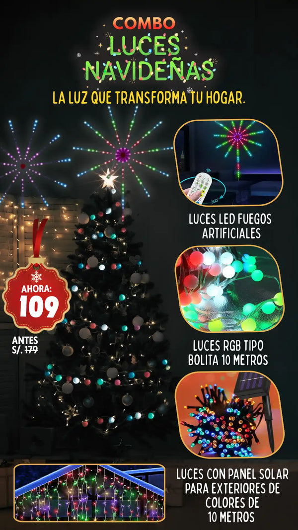 Combo Navideño de Luces Exteriores 10 Metros + Luces para Arbol + Luces de Fuego Artificial