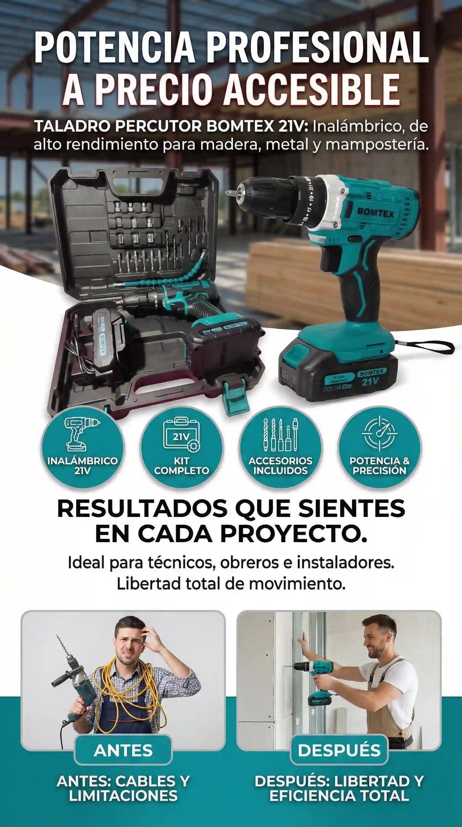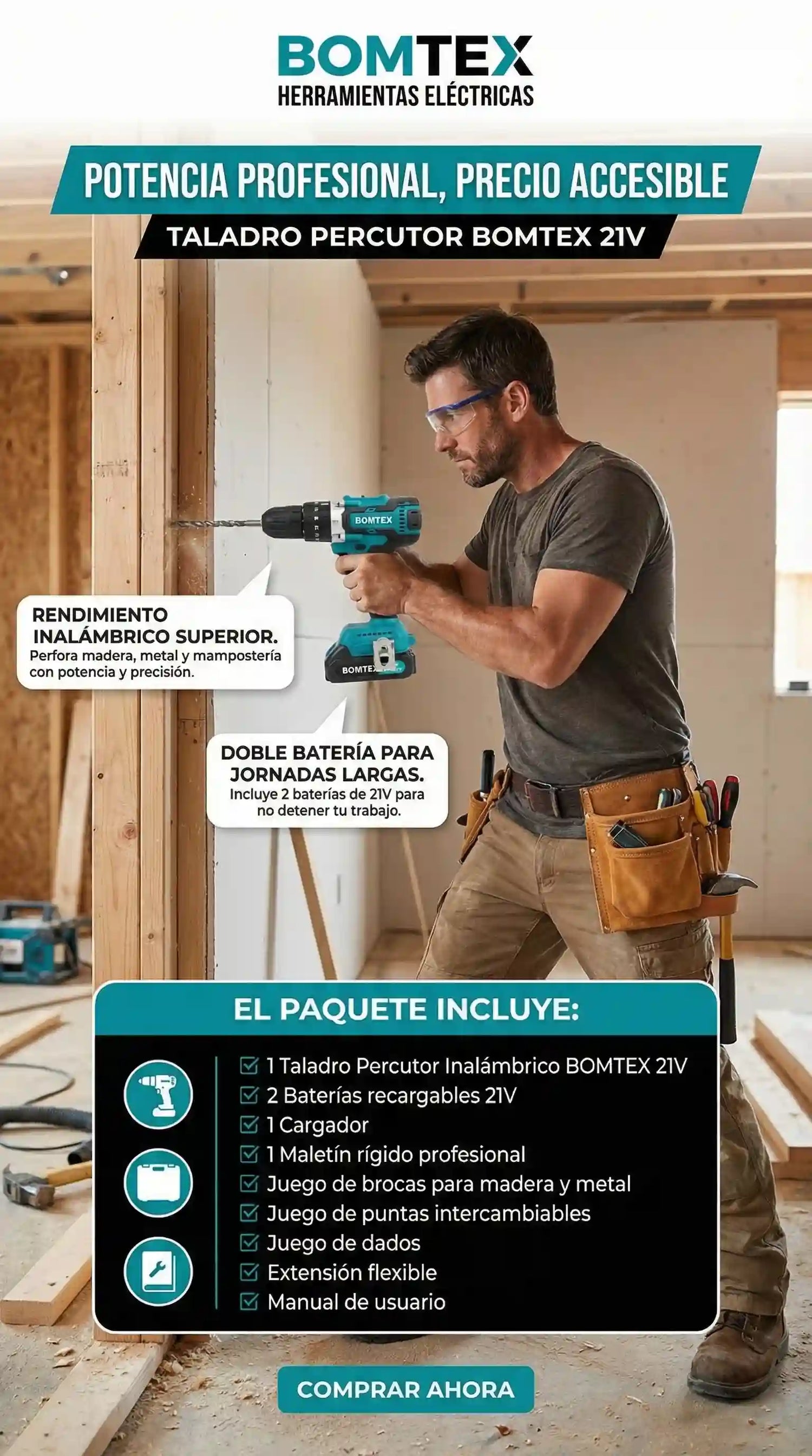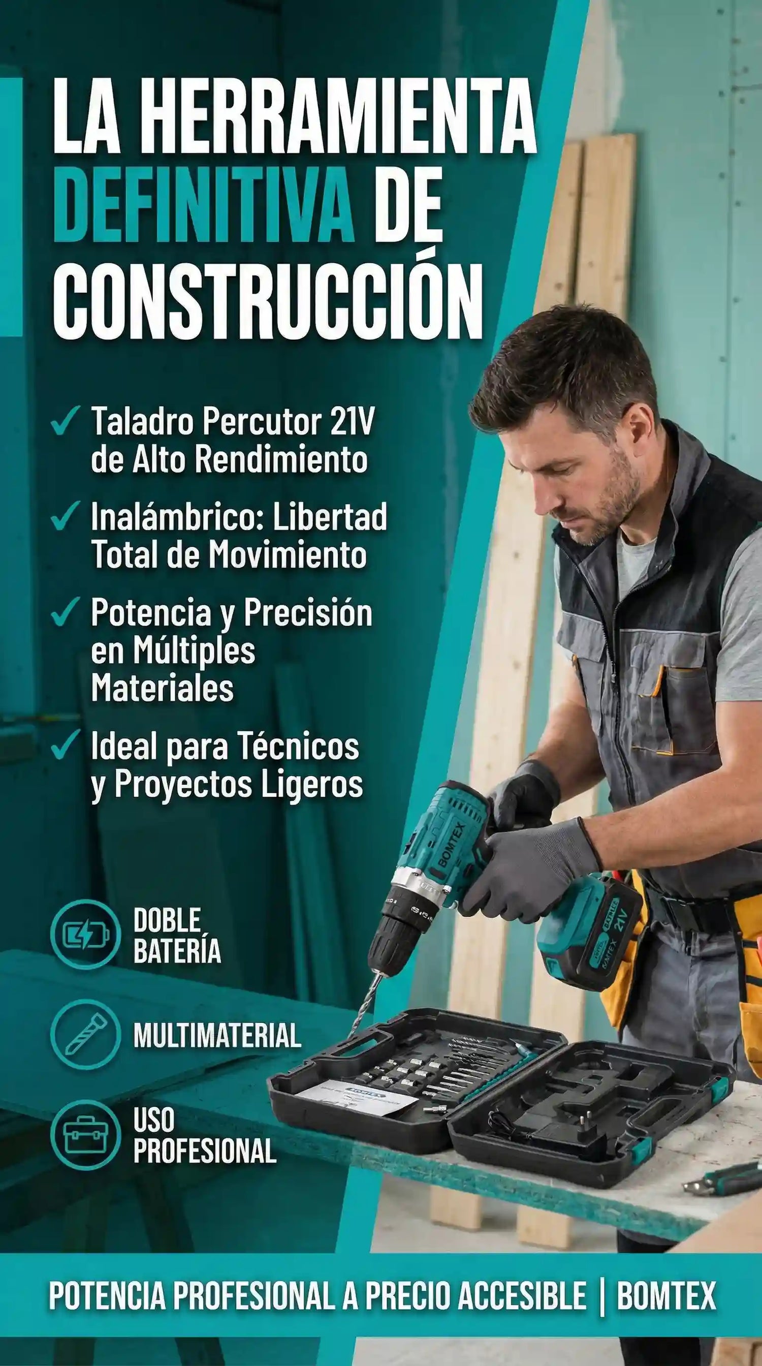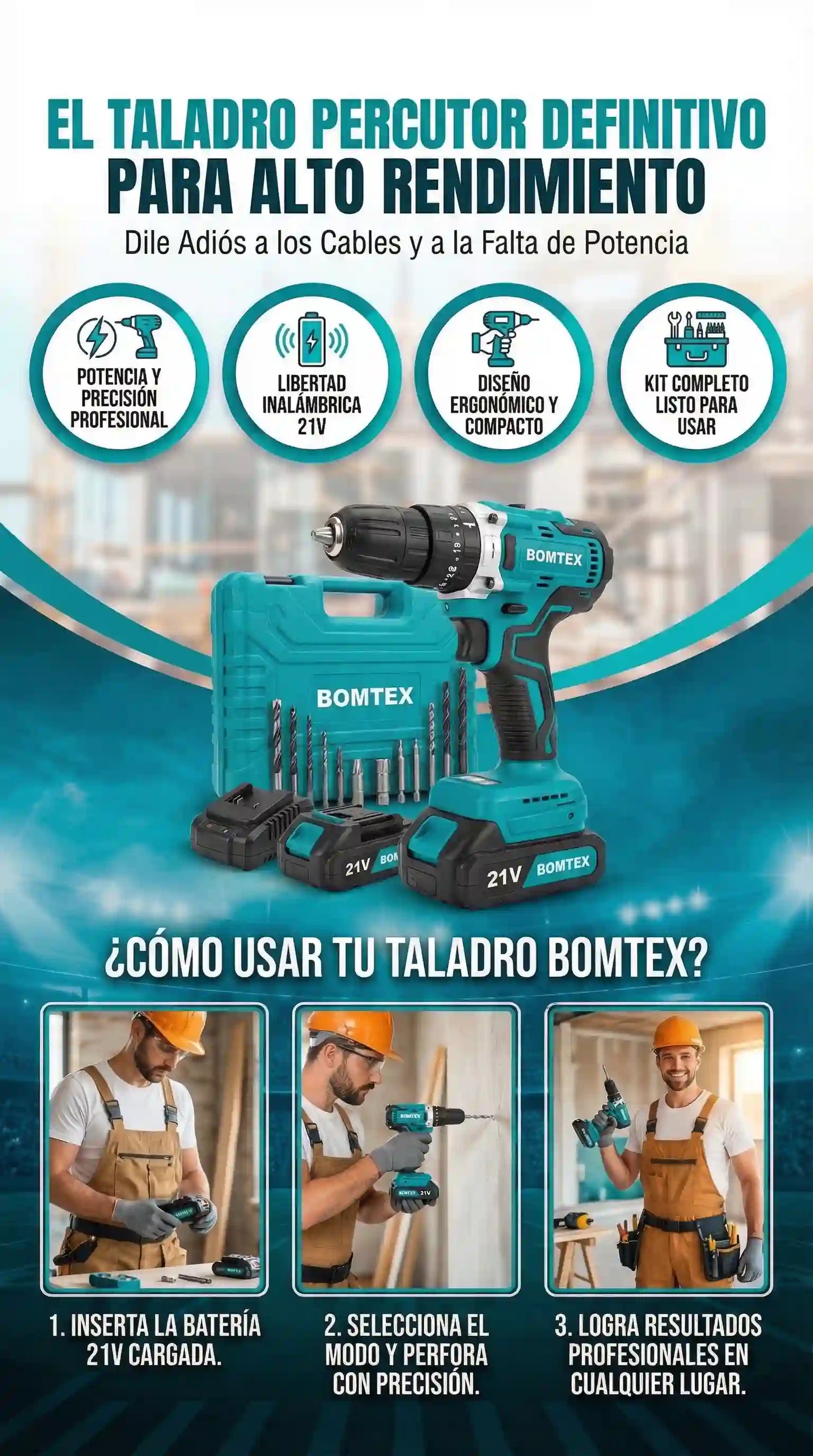 El Taladro Percutor BOMTEX 21V es una herramienta inalámbrica de alto rendimiento diseñada para perforar madera, metal, plástico y mampostería con potencia y precisión.